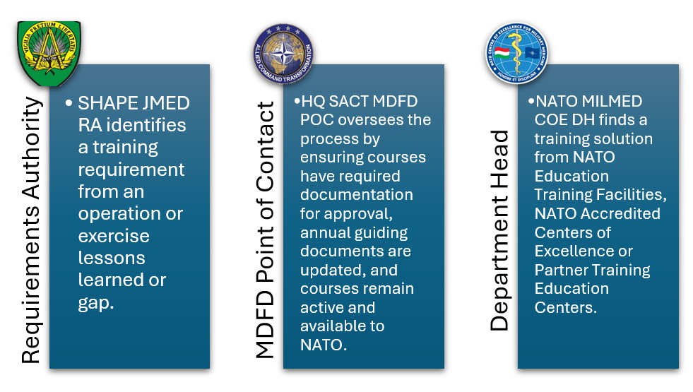 The NATO MILMED COE was nominated by ACT Joint Force Trainer (JFT) to be the Department Head (DH) for the NATO Medical Support (Med Sup) Discipline, and the appointment was approved by the North Atlantic Council (NAC) on 25 June 2015. In the area of education and training, the NATO MILMED COE plays a dual role, acting as DH, and as a NATO-accredited education and training provider.