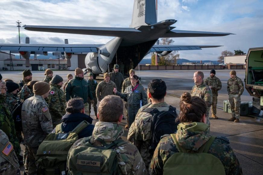 NATO Centre of Excellence for Military Medicine Medical Evaluation Course students and instructors, 86th Aeromedical Squadron Airmen, 16th Sustainment Brigade Soldiers and Landstuhl Regional Medical Center Airmen took part on a mock medical evaluation at Ramstein Air Base and Kaiserslautern, at the US HHC 21 st Theater Sustainment Command, Germany, 17-21 November, 2025. The mock evaluation allowed MEDEVAL students from 11 nations to observe how a fully configured aeromedical evacuation mission would be prepared, staffed and assessed during a real-world NATO operation.